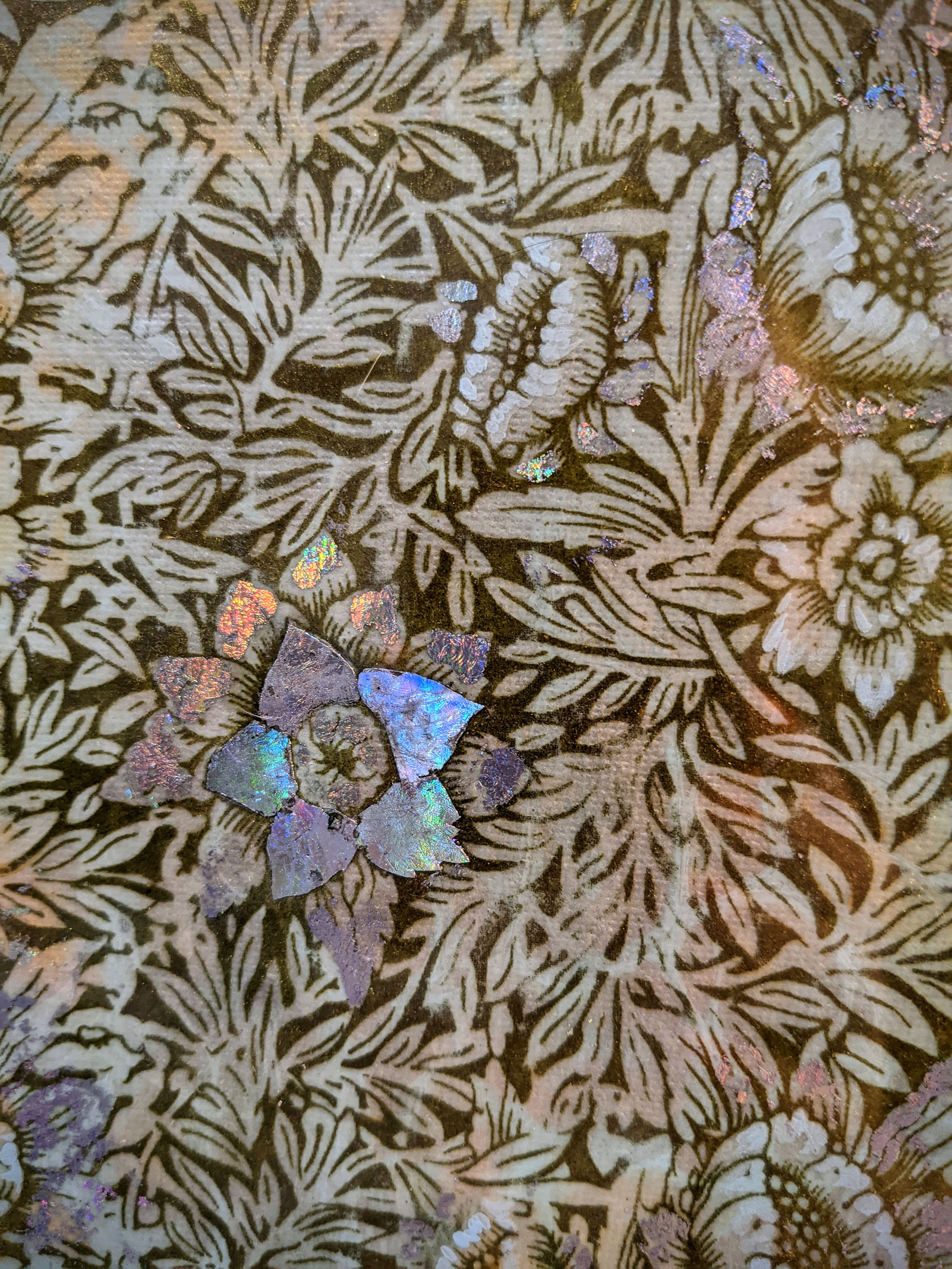 Image transfer of floral designs over an acrylic pour with highlights of gold acrylic paint and holographic foil.