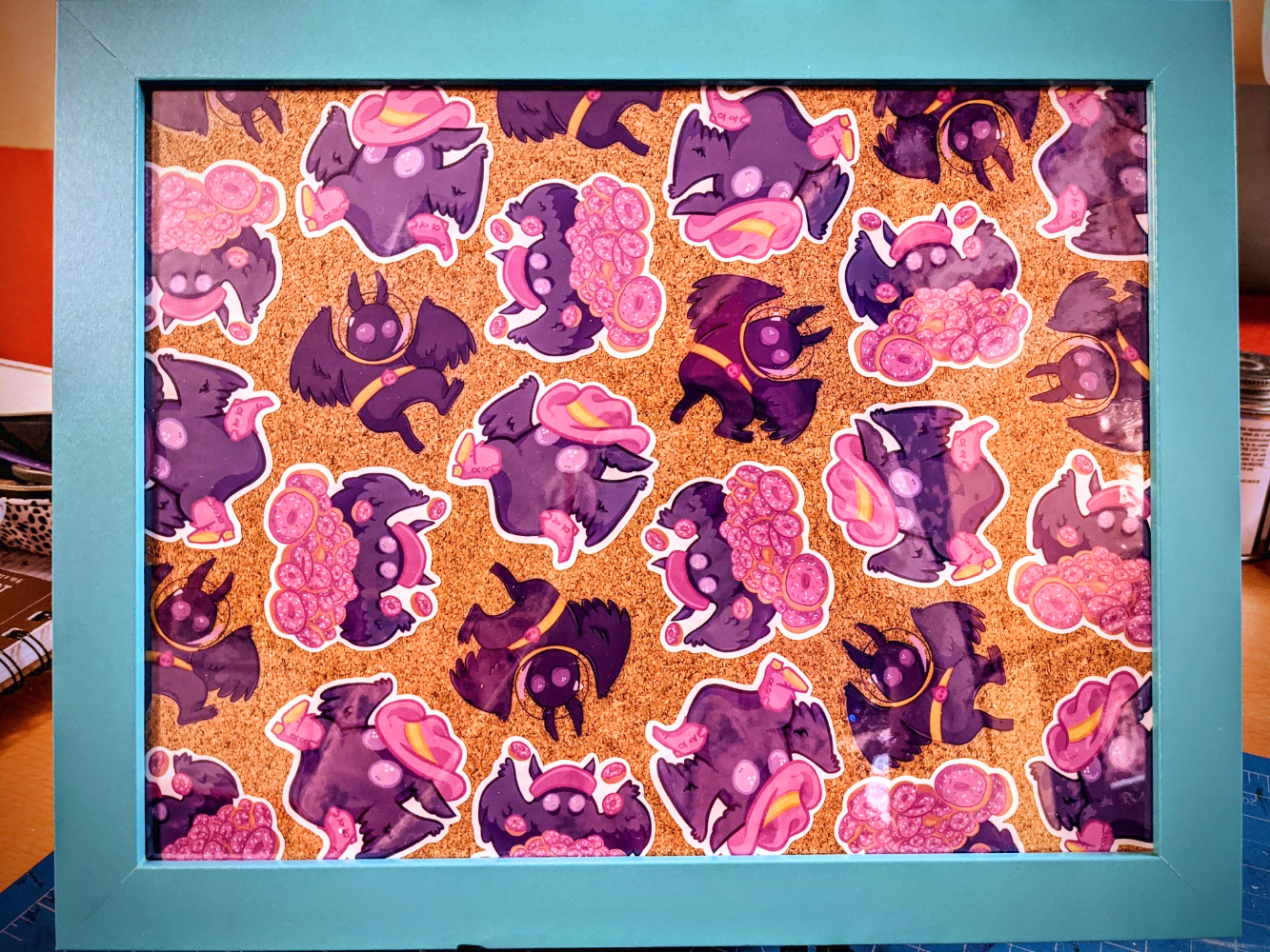 Do you really like Mothman? Do you fear committing to placing a sticker somewhere? Then this cheerful collage featuring my Mothman stickers on a cozy cork background is just for you!