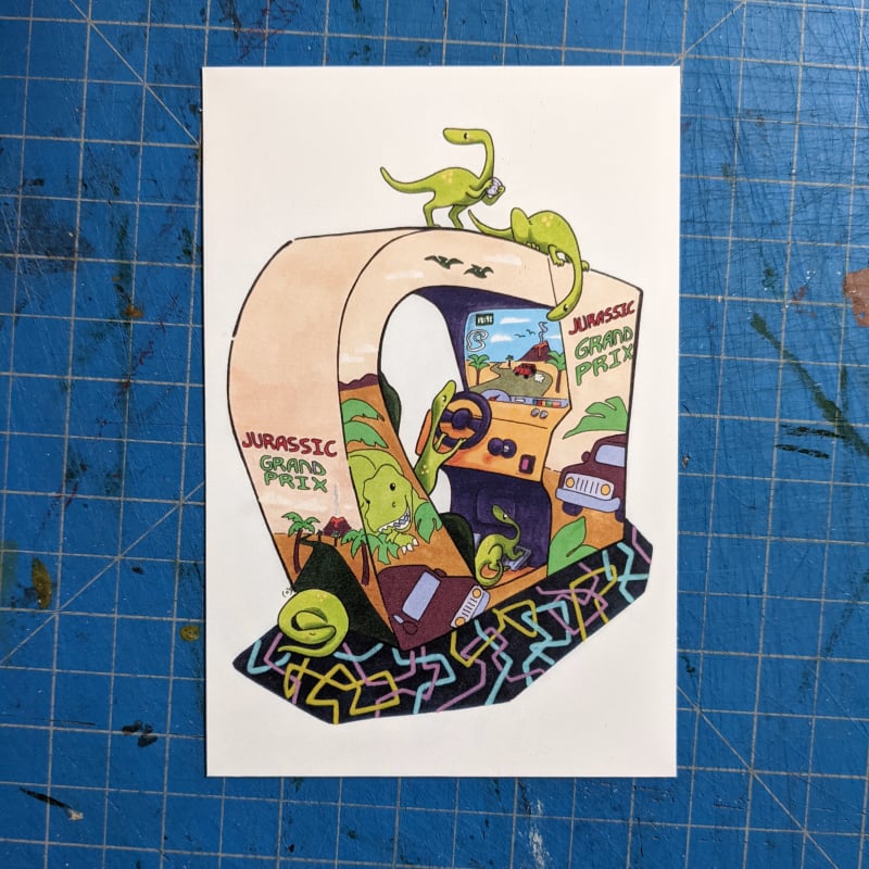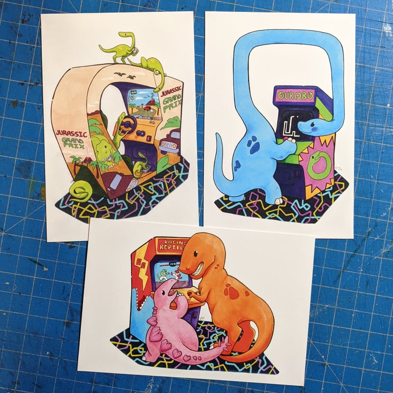 Just some of your favorite dinosaurs having a good time playing some classic arcade games and only the highest quality carpeting around.